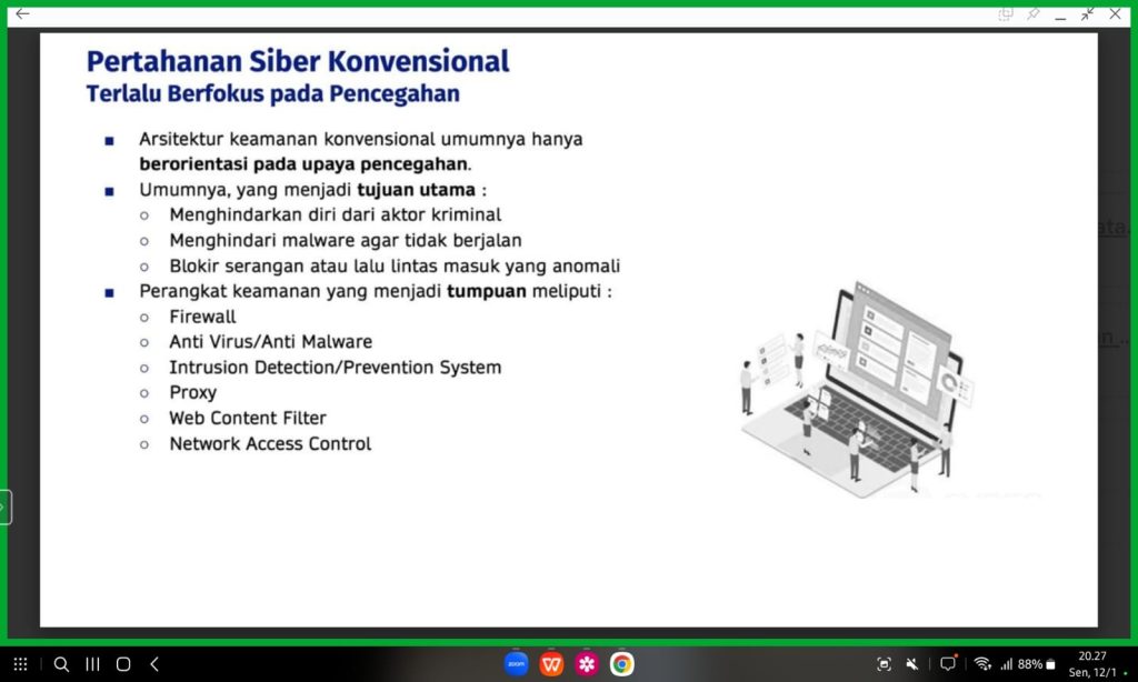 Selama sesi pelatihan, pemateri menjelaskan konsep dasar Legal SOC Analyst, termasuk definisi, ruang lingkup kerja, dan peran strategis profesi ini dalam mendukung tata kelola keamanan informasi di suatu organisasi. Selain itu, dibahas pula keterkaitan antara regulasi hukum, perlindungan data pribadi, kepatuhan terhadap peraturan perundang-undangan, serta tanggung jawab hukum dalam penanganan insiden keamanan siber.