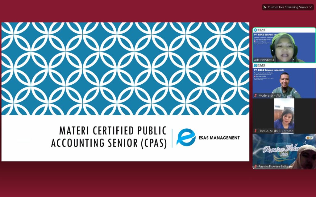 Pelatihan Sertifikasi Public Accounting Senior tersebut diselenggarakan dengan durasi kurang lebih 2 jam yang dilaksanakan melalui platform zoom meeting dan Youtube ESAS Management.Sertifikasi ini menghadirkan 1 narasumber yang tentunya Professional dalam bidang Legal. Beliau adalah Ade Nahdiatul, M.Akt., CTT., CAAT., CADE. (Dosen Akuntansi & Pajak, Praktisi Akuntansi & Peneliti, Asesor dan Certified Trainer BNSP RI), dengan seorang moderator yaitu Abi / Muhammad Akbar Ramadhan, S.T., CDMS. (moderator & Customer Relation Officer ESAS Management).