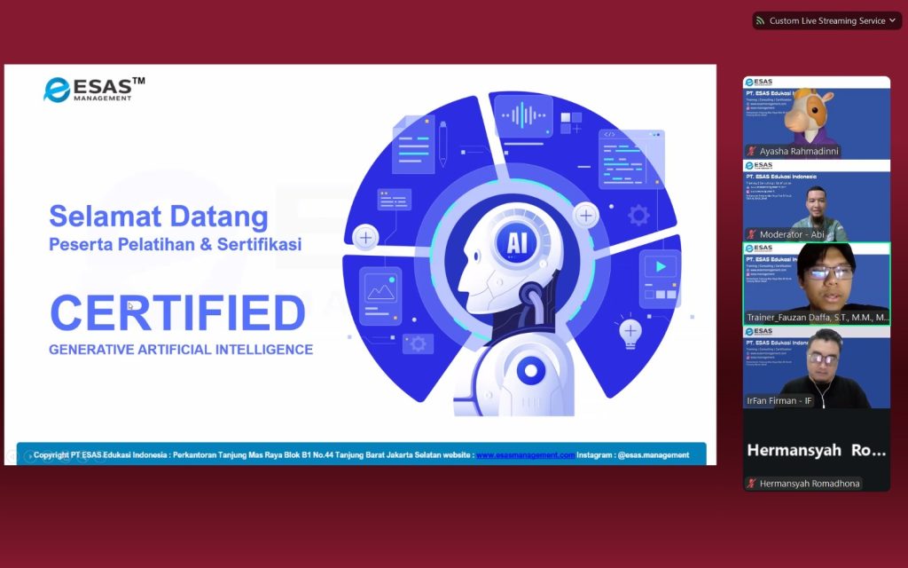 Pelatihan Sertifikasi Generative Artificial Intelligence tersebut diselenggarakan dengan durasi kurang lebih 2 jam yang dilaksanakan melalui platform zoom meeting dan Youtube ESAS Management.Sertifikasi ini menghadirkan 1 narasumber yang tentunya Professional dalam bidang Generative AI. Beliau adalah Fauzan Daffa, S.T., M.M., MCSM., MQAA., MBM., CIPM., CTEM., Dipl. PM. (Master Trainer Esas Management, Trainer Profesional Berlisensi International Trainer, Generative AI Specialist), dengan seorang moderator yaitu Abi / Muhammad Akbar Ramadhan, S.T., CDMS. (moderator & Customer Relation Officer ESAS Management).