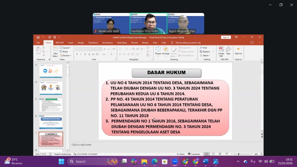 Pengelolaan aset desa yang baik merupakan salah satu kunci terwujudnya pemerintahan desa yang transparan, akuntabel, dan berkelanjutan. Menyadari pentingnya hal tersebut, ESAS Management menyelenggarakan pelatihan Certified Village Asset Manager (CVAM) sebagai upaya meningkatkan kapasitas aparatur desa dan pihak terkait dalam mengelola aset desa secara profesional sesuai ketentuan yang berlaku.