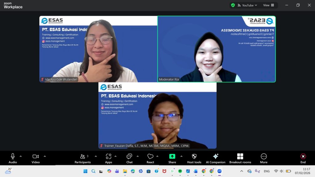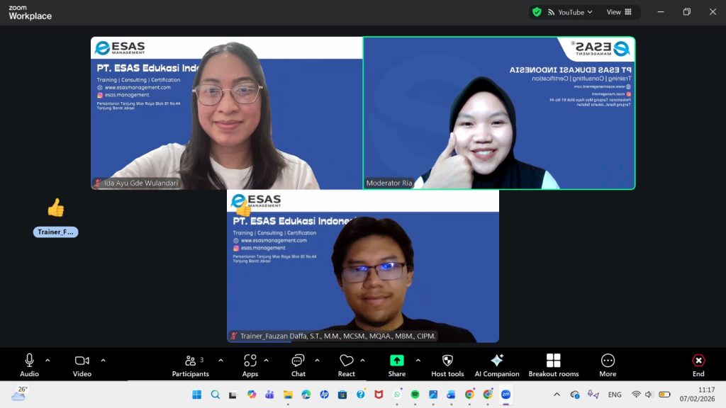 Jakarta, 07 Februari 2026 ESAS Management telah melaksanakan pelatihan CCME dengan diikuti oleh 1 peserta dari berbagai macam latar belakang dan domisili. Selain itu pelatihan ini dilaksanakan dan di dampingi oleh Siti Khurriyyah selaku moderator di pelatihan tersebut Pelatihan dan sertifikasi ini menghadirkan satu narasumber yang tentunya sudah sangat berpengalaman dan mahir di bidang marketing dan operasional project Yaitu beliau bernama Bapak Fauzan Daffa, S.T., MCSM., MQAA.,MBM., CIPM., CTEM.
