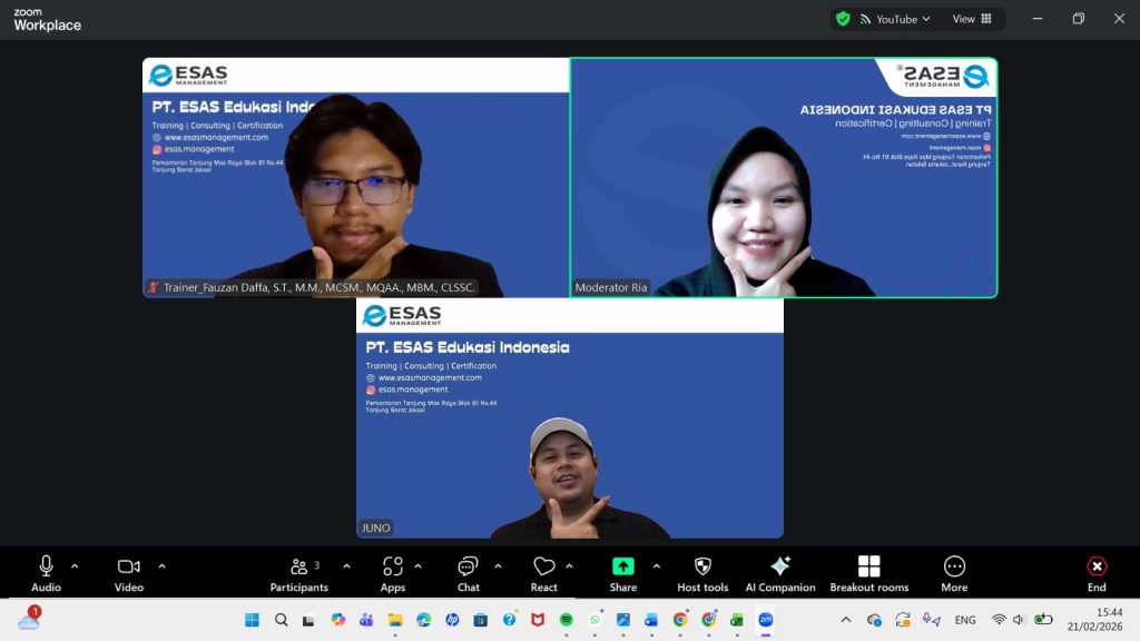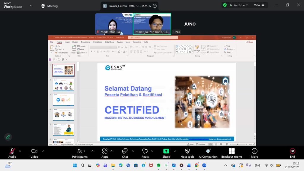 Jakarta, 21 Februari 2025 ESAS Management telah melaksanakan pelatihan Modern Retail Business melalui zoom meeting dan live streaming di YouTube.Pelatihan ini diikuti oleh satu peserta dari berbagai macam latar belakang dan domisili. Pelatihan dan sertifikasi ini menghadirkan satu narasumber yang tentunya sudah sangat berpengalaman dan mahir di bidang marketing dan operasional project Yaitu beliau bernama Bapak Fauzan Daffa, S.T., MCSM., MQAA.,MBM., CIPM., CTEM.