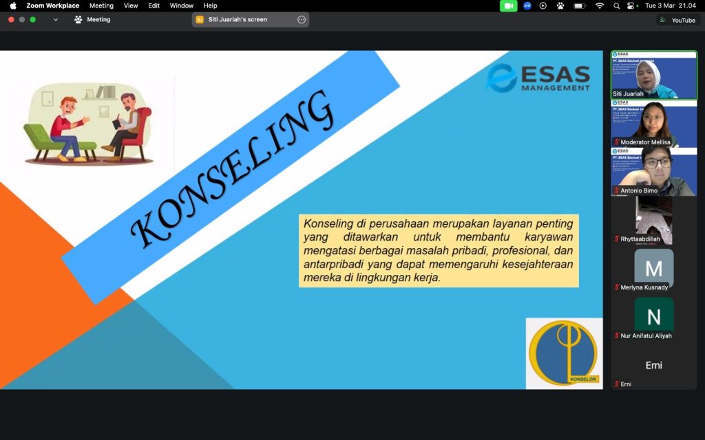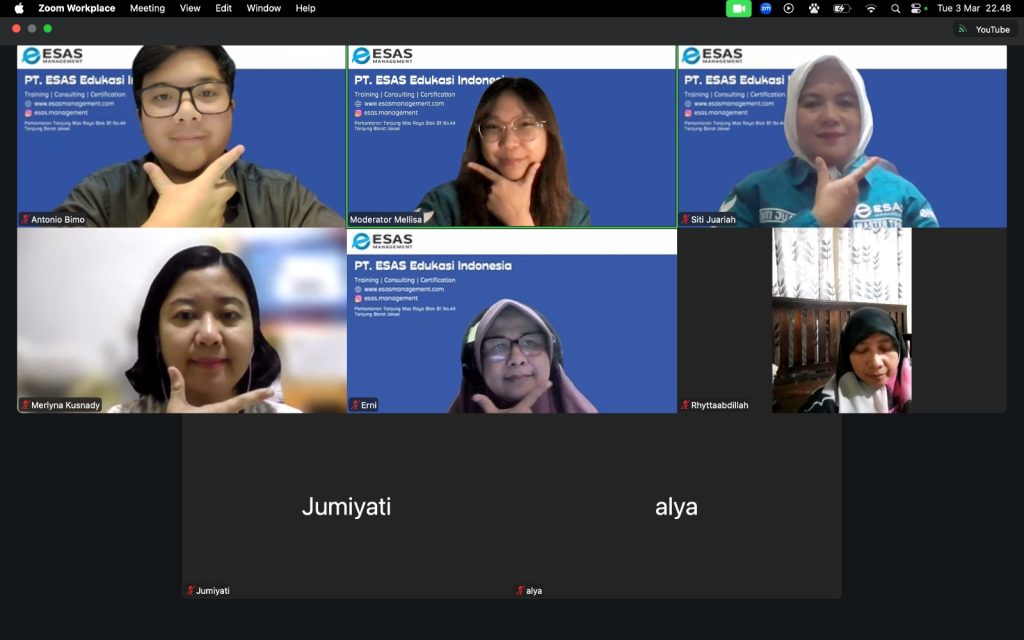 Jakarta, 3 Maret 2026 Esas management sukses menyelenggarakan pelatihan Certified Basic Counseling (CBC). Pelatihan tersebut diselenggarakan pada hari Selasa, 3 Maret 2026 pukul 20.30 s.d 22.30 WIB yang dilaksanakan melalui platform zoom meeting dan Youtube ESAS Management serta dihadiri banyak peserta dari berbagai latar belakang dan domisili yang berbeda.